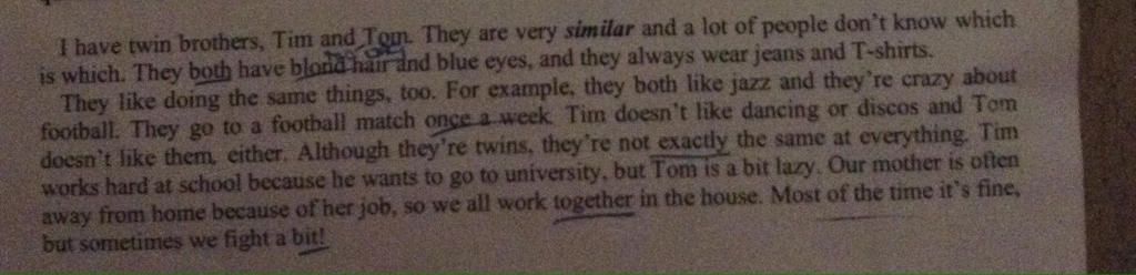 Họ thích làm những điều giống nhau nữa.VD họ đều thích nhạc Jazz và họ yêu đá bóng.Họ đến xem một trận bóng đá 1 tuần /lần.Tim không thích nhảy hay nhạc disco và và Tom cũng thế.Mặc dù họ sinh đôi nhưng họ không thực sự giống nhau hoàn toàn.Tim học hành chăm chỉ ở trường vì anh ấy muốn đỗ Đại học,nhưng Tom thì hơi lười đấy.Mẹ chúng tôi thường đi xa nhà nên anh em chúng tôi tự lo liệu mọi việc.Phần lớn thời gian thì ổn nhưng có lúc chúng tôi cãi nhau một chút!
