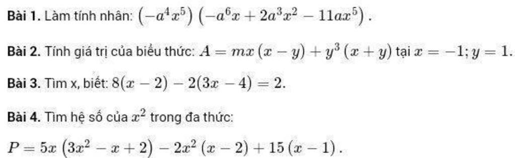 `(-a^4x^5) (-a^6x + 2a^3x^2 – 15ax^5)`
