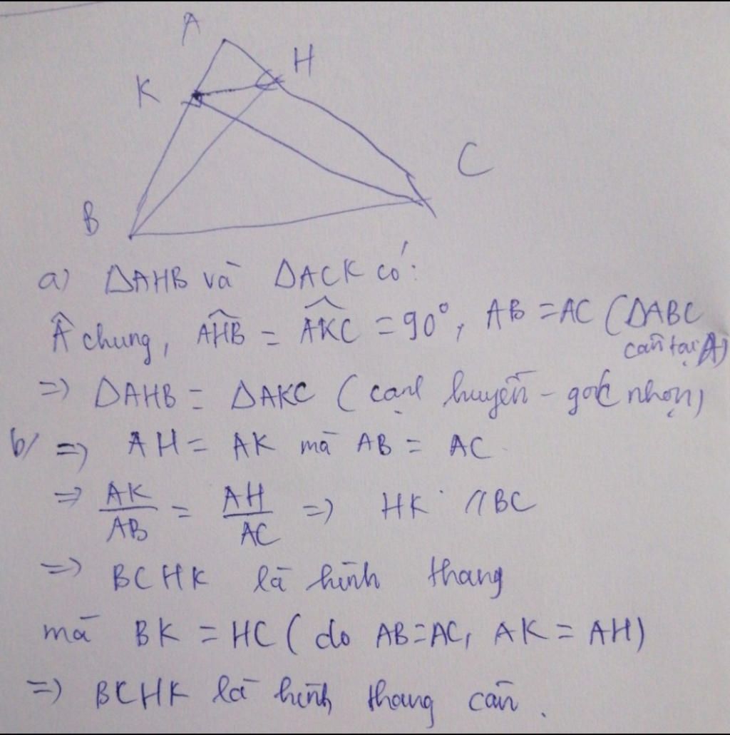 bài 1 : cho tam giác ABC cân tại A có BH và CK là hai đường cao chứng minh