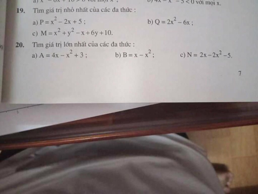 \(\) \(N = 2x - 2{x^2} – 5\) \( = - 2\left( {{x^2} - x +\displaystyle {5 \over 2}} \right)\)\( = \displaystyle - 2\left( {{x^2} - 2.x.{1 \over 2} + {1 \over 4} + {9 \over 4}} \right)\)