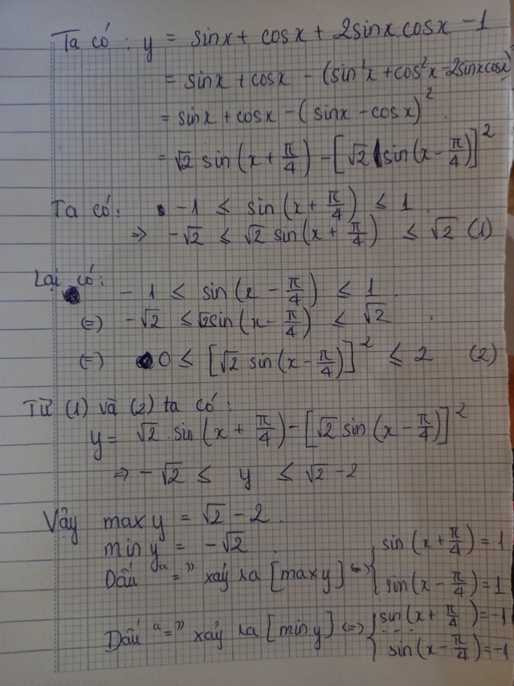 Vậy GTNN của hso là $-\dfrac{9}{4}$ đạt đc khi $x = \arcsin \left( -\dfrac{1}{2\sqrt{2}} \right) - \dfrac{\pi}{4} + 2k\pi$ hoặc $x = \dfrac{3\pi}{4} - \arcsin \left( -\dfrac{1}{2\sqrt{2}} \right) + 2k\pi$ và GTLN của hso là $\sqrt{2}$ đạt đc khi $x = \dfrac{\pi}{4} + 2k\pi$.