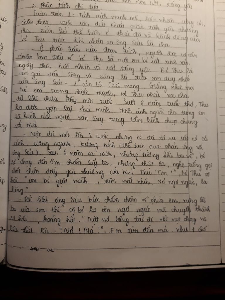 “con bé đáo để thật“. Mặc dù vậy, bé Thu không phải là đứa trẻ chỉ biết “chống đối”, quậy phá, bé cũng có suy nghĩ. Khi thấy ông Sáu “gắp một cái trứng cá to vàng để vào chén nó”, Thu “liền lấy đũa xới vào chén, để đó rồi bất thần hất cái trứng ra”. Từ “bất thần” như nhãn tự của câu văn, nó cho chúng ta thấy đó không phải là hành động cố tình mà phải chăng là hành động bất cẩn do đang mải suy nghĩ ? Bởi nếu phản đối, em đã hất miếng trứng ra ngay từ đầu. Nhưng do quá yêu con, quá thương con và mong mỏi một tiếng gọi “ba” ấm áp mà luôn bị chối từ nên khi con bé làm như vậy, ông Sáu đã không kiềm chế được nên đã đánh và mắng con : “Sao mày cứng đầu quá vậy, hả?“. Sự bướng bỉnh, ngang ngạnh không phải là bản chất tính cách của bé Thu nên dù bị cha đánh em không “khóc, giẫy, đạp đổ cả mâm cơm” mà “gắp lại cái trứng cá để vào chén, rồi lặng lẽ đứng dậy, bước ra khỏi mâm rồi sang nhà ngoại, mét với ngoại và khóc ở bên đấy”.