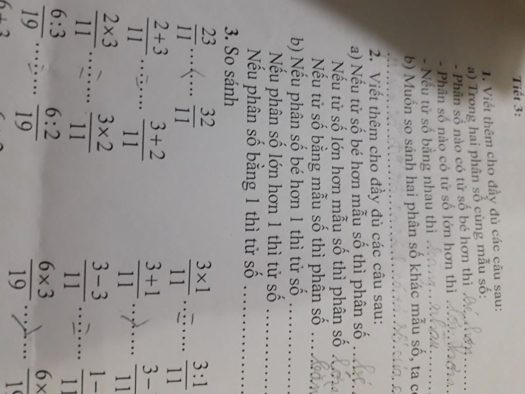 Nếu phân số bé hơn 1 thì tử số < mẫu số Nếu phân số lớn hơn 1 thì tử số > mẫu số Nếu phân số bằng 1 thì tử số = mẫu số vod nhe