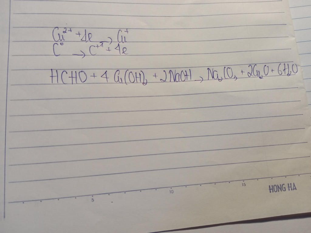 $HCHO + 4Cu(OH)_2 + 2NaOH \to Na_2CO_3 + 2Cu_2O + 6H_2O$