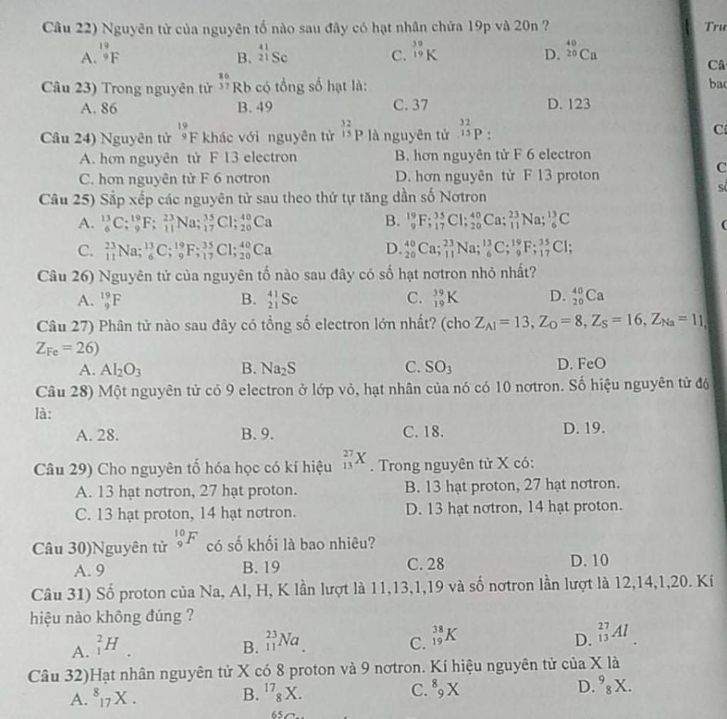 Câu 22) Nguyên từ của nguyên to nào sau đây có hat nhân chửa 19p và 20n ?