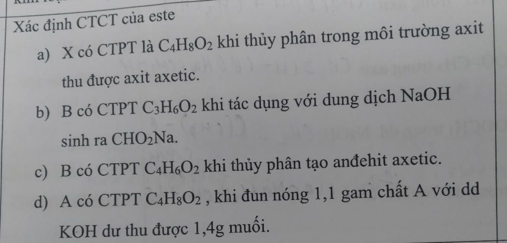 c, C4H6O2: RCOOR'⇒ tạo ra CH2=CH-OH ancol ko bền phân huỷ ⇒CH3CHO
