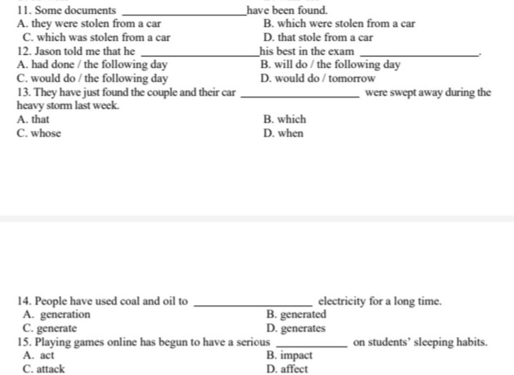 11. B ( câu bị động thì quá khứ đơn, some documents -> số nhiều -> dùng were)