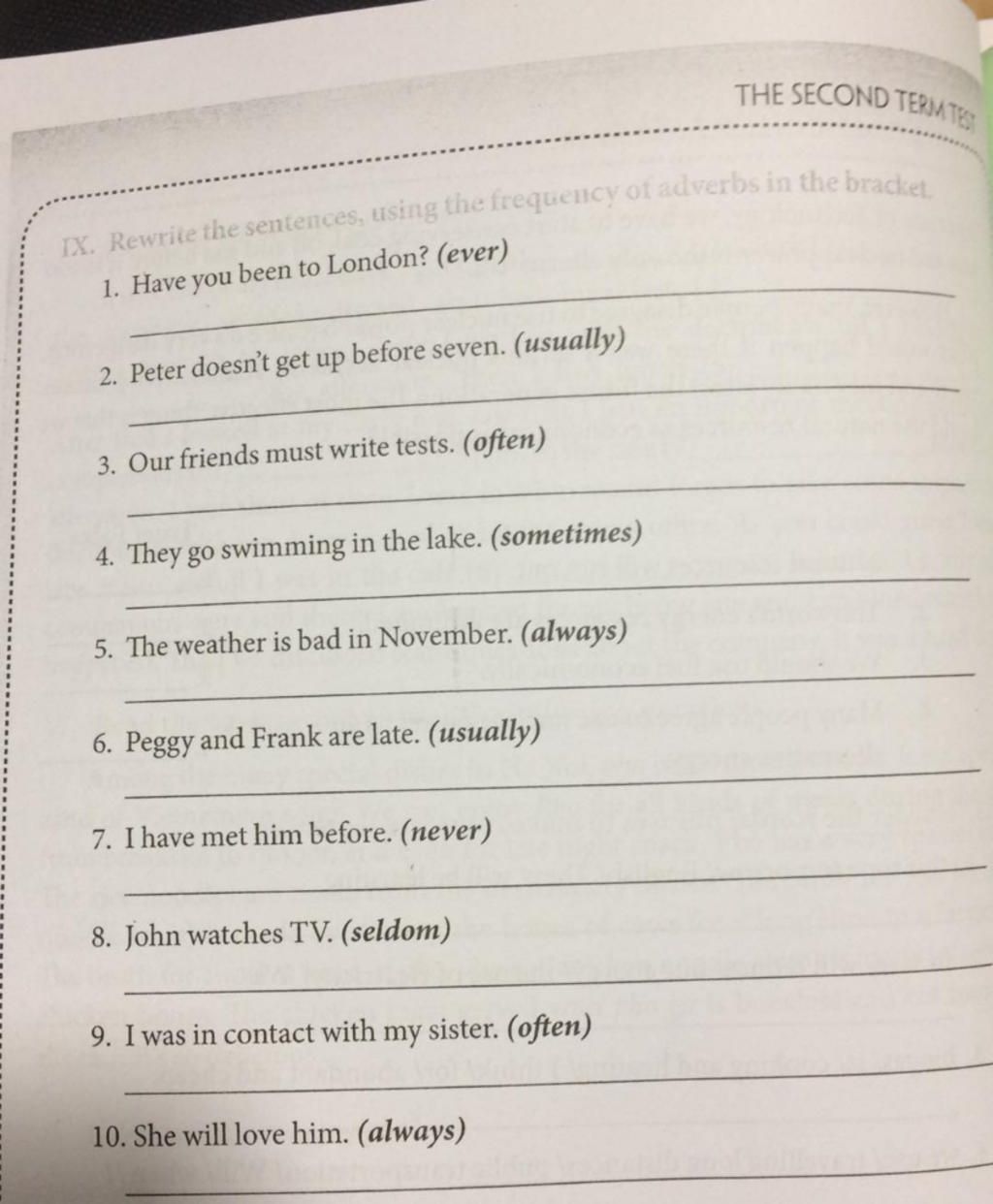 Have you ever been to London? Peter doesn't usually get up before seven. Our friends often must write tests. They sometimes go swimming in the lake. The weather is always bad in November. Peggy and Frank are usually late. I have never met him before. John seldom watches TV. I was often in contact with my sistẻr She will always love him. Rút gọnHave you ever been to London? Peter doesn't usually get up before seven. Our friends often must write tests. They sometimes go swimming in the lake. The weather is always bad in November. Peggy and Frank are usually late. I have never met him before. J... xem thêm