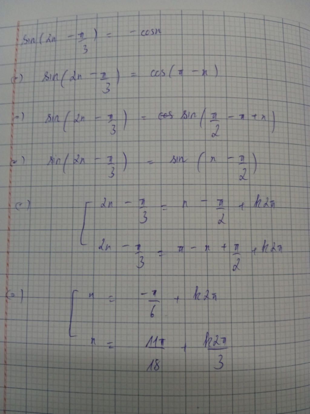 ⇔\(\left[ \begin{array}{l}2x-\frac{\pi}3=x-\frac\pi2+k2\pi\\2x-\frac{\pi}3=\pi-x+\frac{\pi}2+k2\pi\end{array} \right.\)
