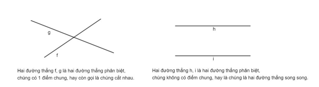 Hai đường thẳng phân biệt là hai đường thẳng không trùng nhau,cắt nhau hoặc song song với nhau.