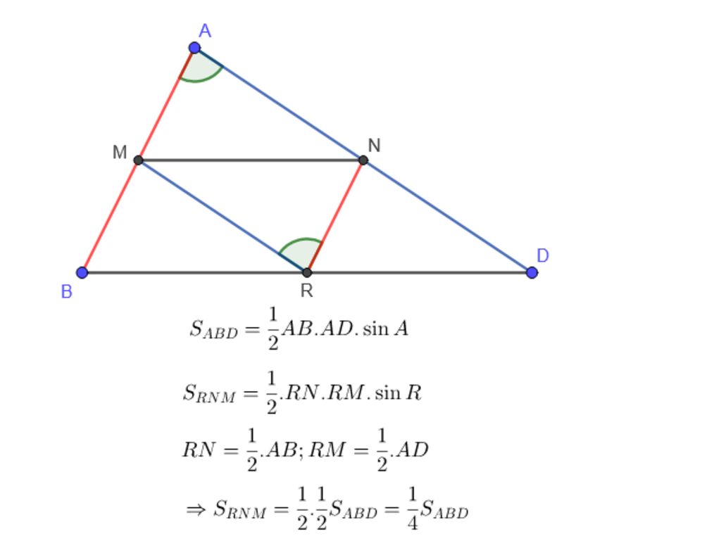 Ta có tam giác $BRM$ đồng dạng với tam giác $BDA$ với tỉ số $\dfrac{1}{2}$, suy ra