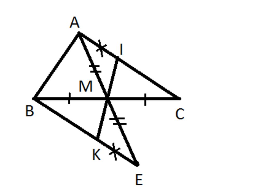 góc IAM = góc KEM (tam giác AMB = tam giác EMC)