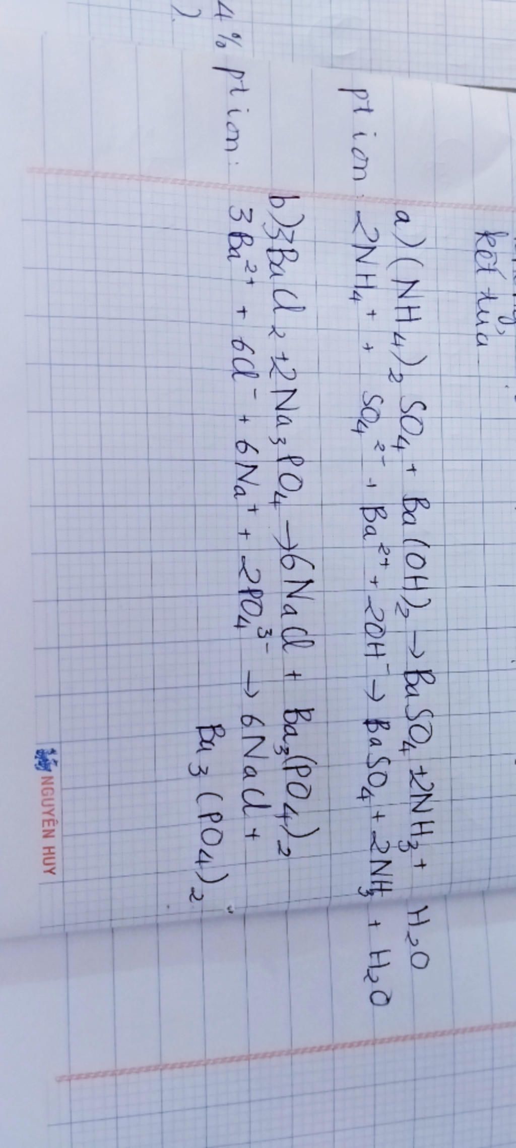 b) \(3B{a^{2 + }} + 6C{l^ - } + 6N{a^ + } + 2P{O_4}^{3 - }\xrightarrow{{}}3B{a_3}{(P{O_4})_2} + 6N{a^ + } + 6C{l^ - }\)