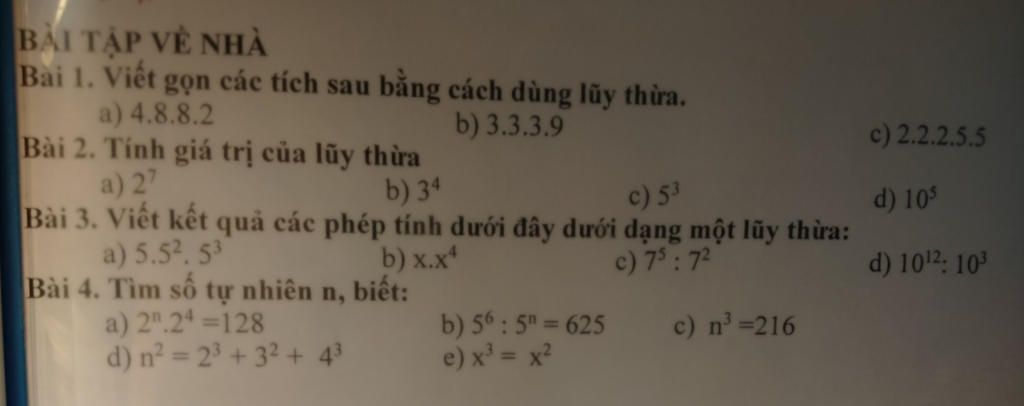 Bai 1. Viết gọn các tích sau bằng cách dùng lũy thừa.