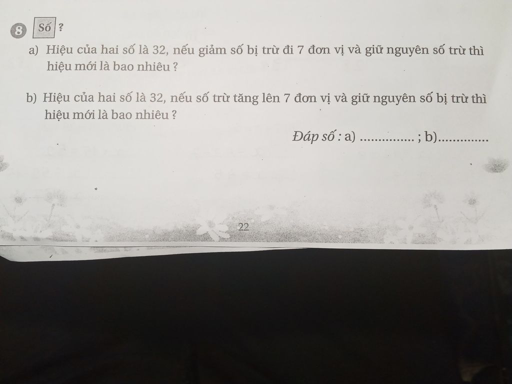 a) Hiệu của hai số là $32$, nếu giảm số bị trừ đi $7$ đơn vị và giữ nguyên số trừ thì hiệu mới là: