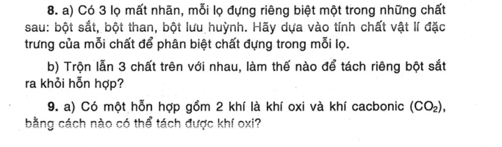 Trộn đều hỗn hợp, đưa nam châm lại gần. Sắt bị nam châm hút hết, ta được sắt tinh khiết.