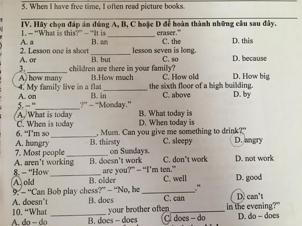IV. Hãy chọn đáp án đúng A, B, C hoặc D để hoàn thành những câu sau đây.