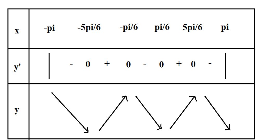 $y'=0 ↔ cos2x=\dfrac{1}{2} ↔ \left[ \begin{array}{l}2x=\dfrac{\pi}{3}+k2\pi\\2x=-\dfrac{\pi}{3}+k2\pi\end{array} \right.$