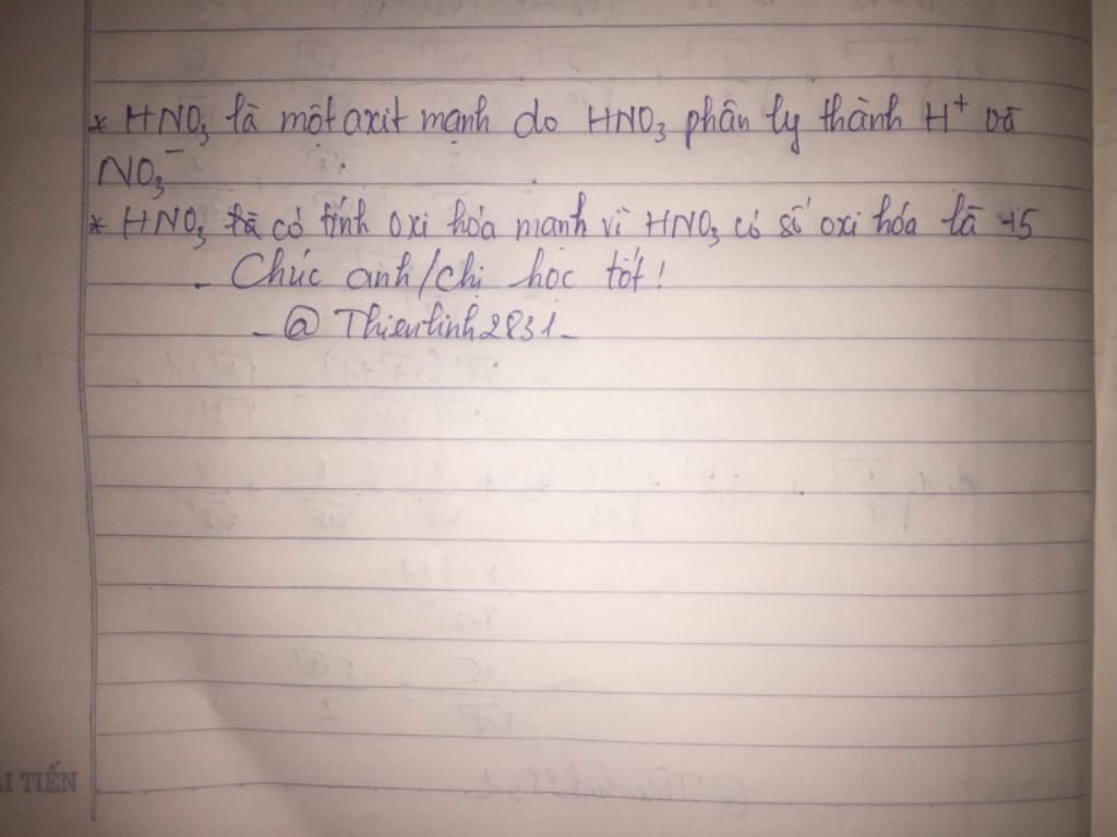 - Tính oxi hoá mạnh: số oxi hoá của N là $+5$, cực đại trong các mức oxi hoá của N nên $HNO_3$ có tính oxi hoá mạnh.