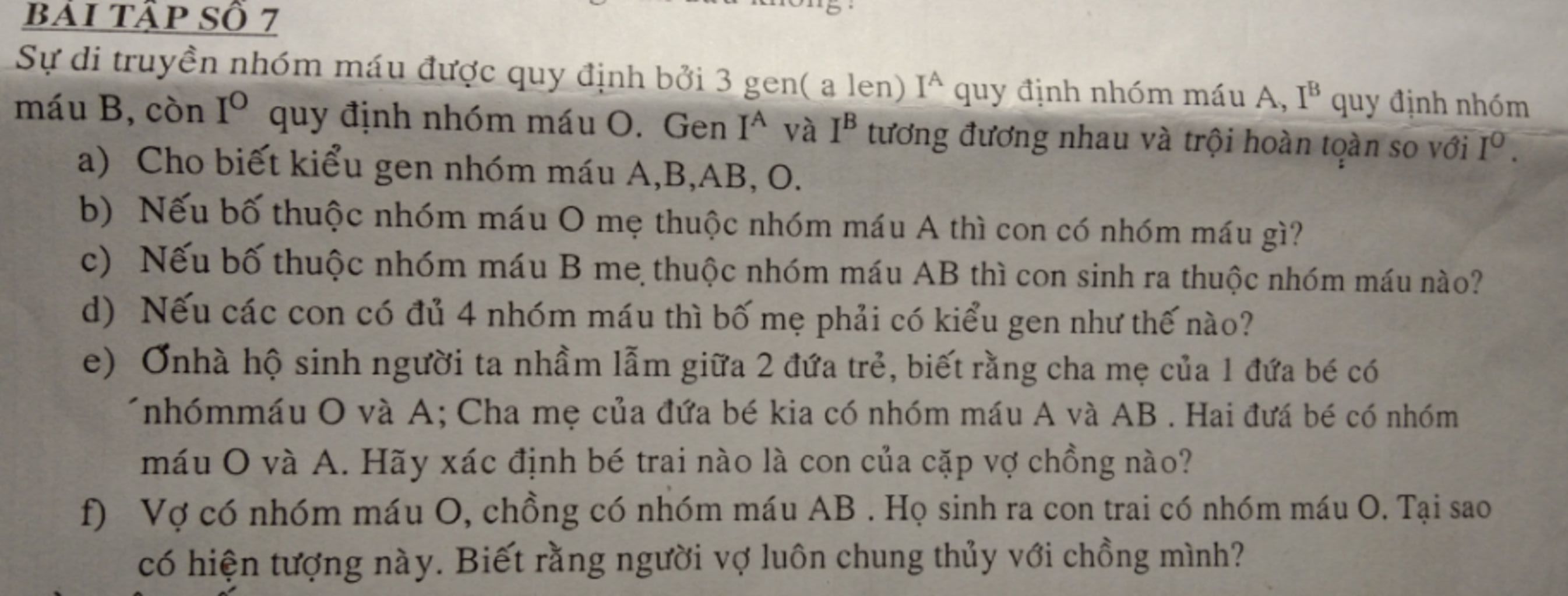 - Bố nhóm máu O có kiểu gen $I^{O}$$I^{O}$
