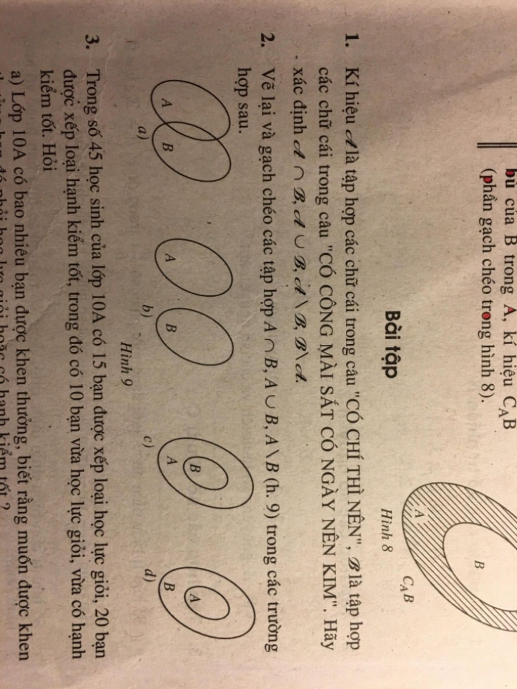1. Kí hiệu A là tập hợp các chữ cái trong câu "CÓ CHÍ THÌ NÊN", Blà tập hợp