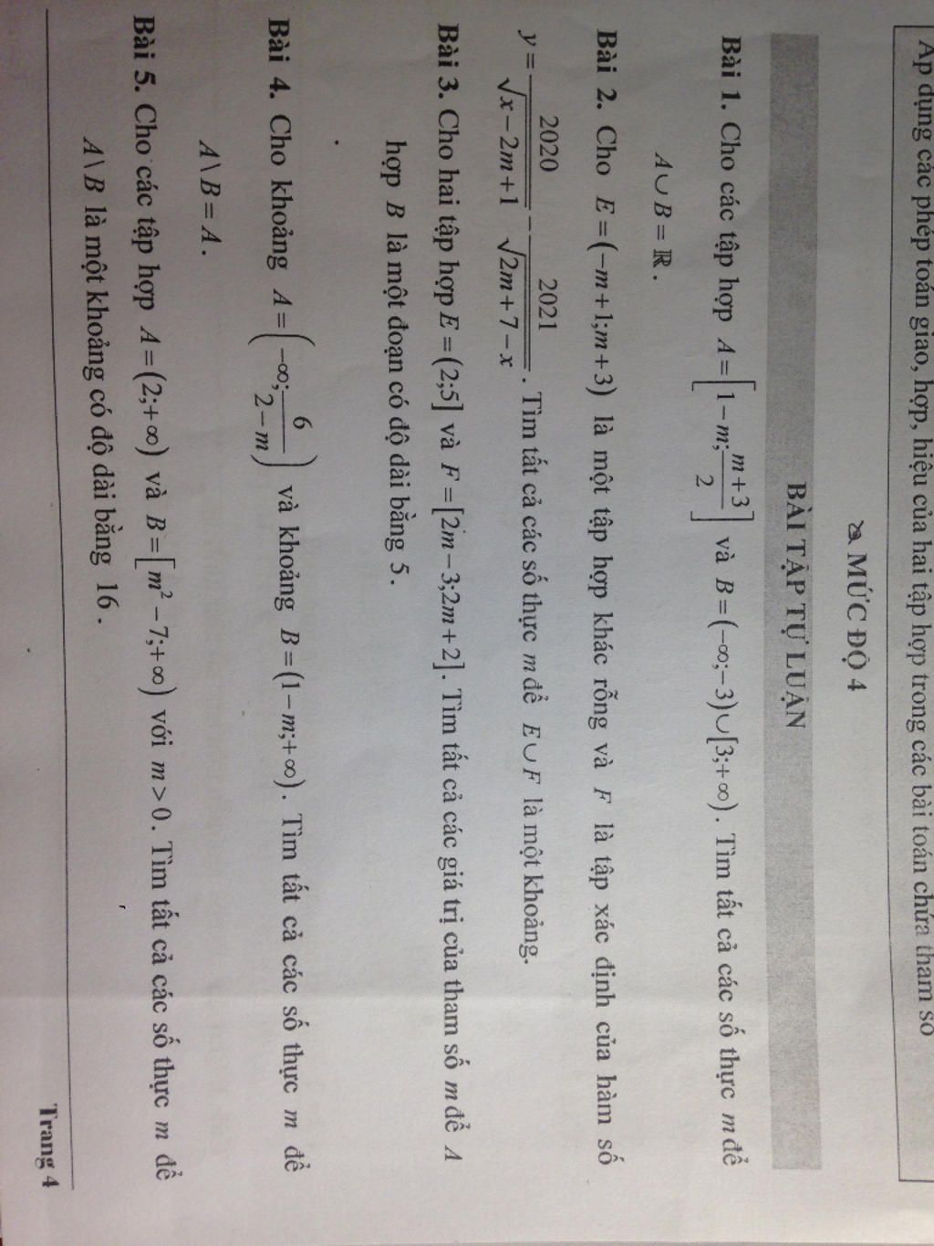 Ap dụng các phép toán giao, hợp, hiệu của hai tập hợp trong các bài toán chứa tham sỐ