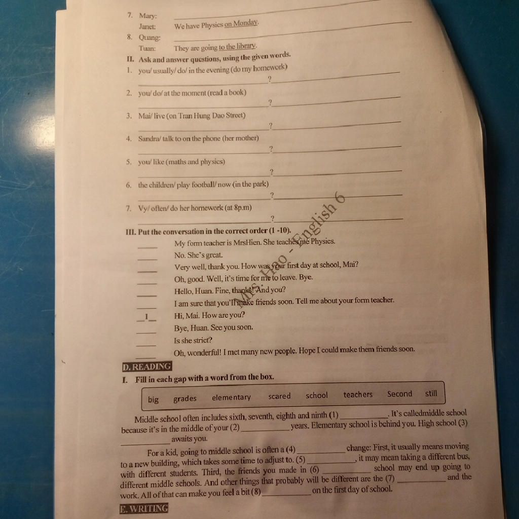 2.Very well thank you. How was your first day at school, Mai?