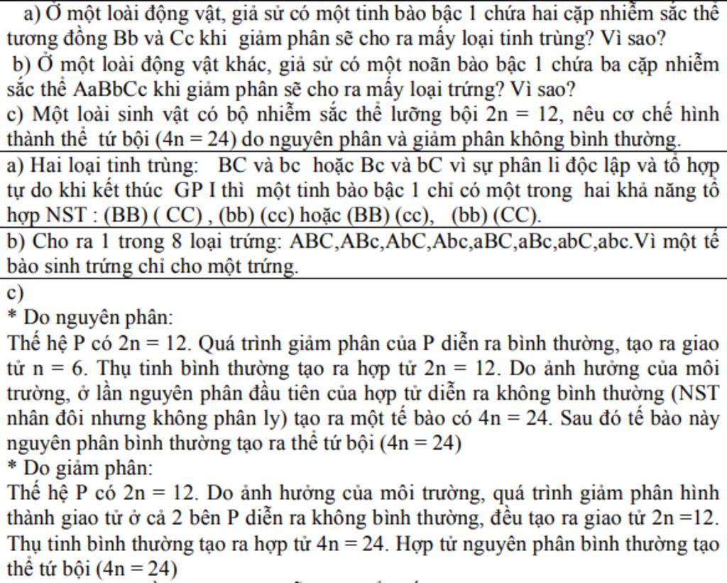 b. Cho ra 1 trong 8 loại trứng: ABC,ABc,AbC,Abc,aBC,aBc,abC,abc.Vì một tế bào sinh trứng chỉ cho một