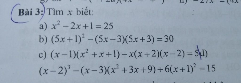 \(\begin{array}{l} a,\ x^2-2x+1=25\\ ⇔(x-1)^2=(±5)^2\\ ⇔\left[ \begin{array}{l}x-1=5\\x-1=-5\end{array} \right.\\ ⇔\left[ \begin{array}{l}x=6\\x=-4\end{array} \right.\\ \text{Vậy x = 6 hoặc x = (- 4)}\\ b,\ (5x+1)^2-(5x-3)(5x+3)=30\\ ⇔25x^2+10x+1-25x^2+9=30\\ ⇔(25x^2-25x^2)+10x=30-1-9\\ ⇔10x=20\\ ⇔x=2\\ \text{Vậy x = 2}\\ c,\ (x-1)(x^2+x+1)-x(x-2)(x+2)=5\\ ⇔x^3-1-x(x^2-4)=5\\ ⇔x^3-1-x^3+4x=5\\ ⇔(x^3-x^3)+4x=5+1\\ ⇔4x=6\\ ⇔x=\dfrac32\\ \text{Vậy x = $\dfrac32$}\\ d,\ (x-2)^3-(x-3)(x^2+3x+9)+6(x+1)^2=15\\ ⇔x^3-6x^2+12x-8-x^3+27+6(x^2+2x+1)=15\\ ⇔(x^3-x^3)-6x^2+12x-8+27+6x^2+12x+6=15\\ ⇔(-6x^2+6x^2)+(12x+12x)=15-6-27+8\\ ⇔24x=-10\\ ⇔x=\dfrac{-5}{12}\\ \text{Vậy x = $-\dfrac{5}{12}$}\end{array}\)