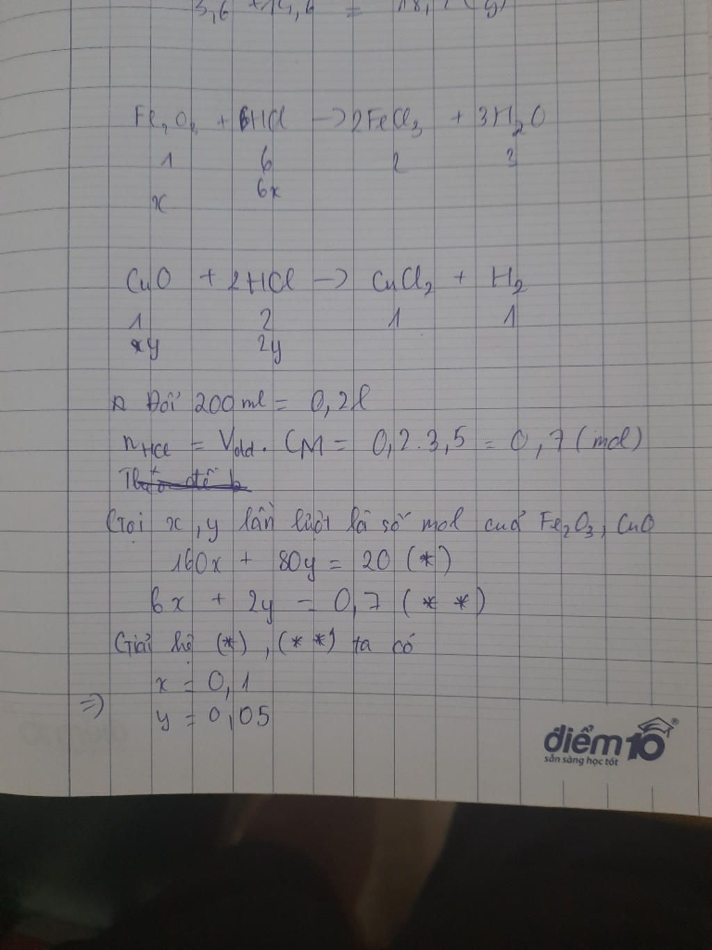 Gọi `x,y` lần lượt là số mol `CuO và Fe_2O_3`