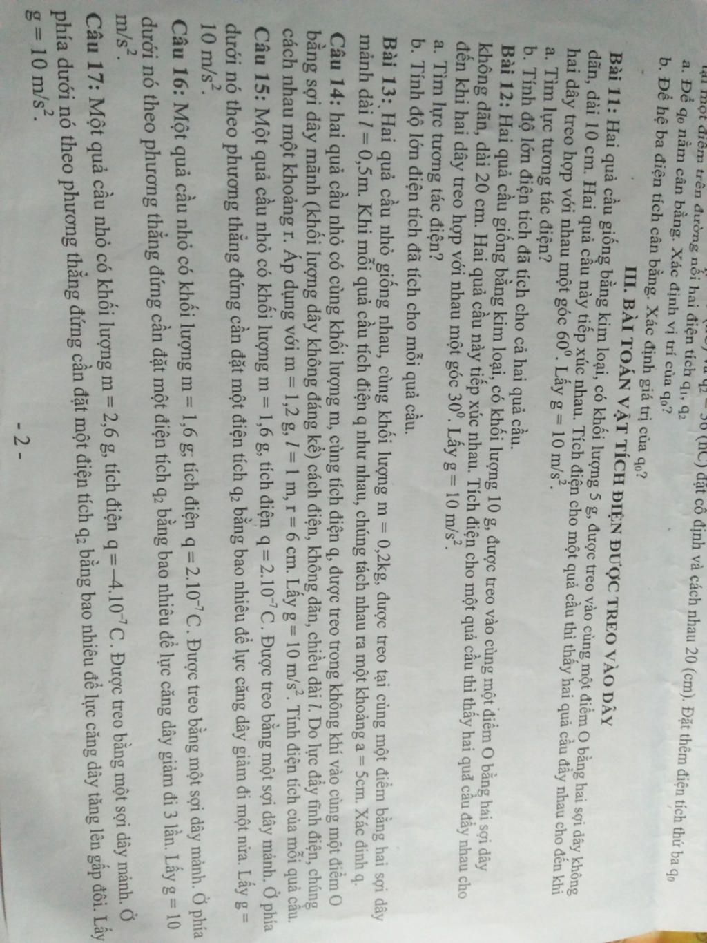 \(F = k\dfrac{{{q^2}}}{{{r^2}}} = k\dfrac{{{q^2}}}{{{{\left( {2l\sin 15} \right)}^2}}} \Rightarrow q = \pm 1,{79.10^{ - 7}}\)