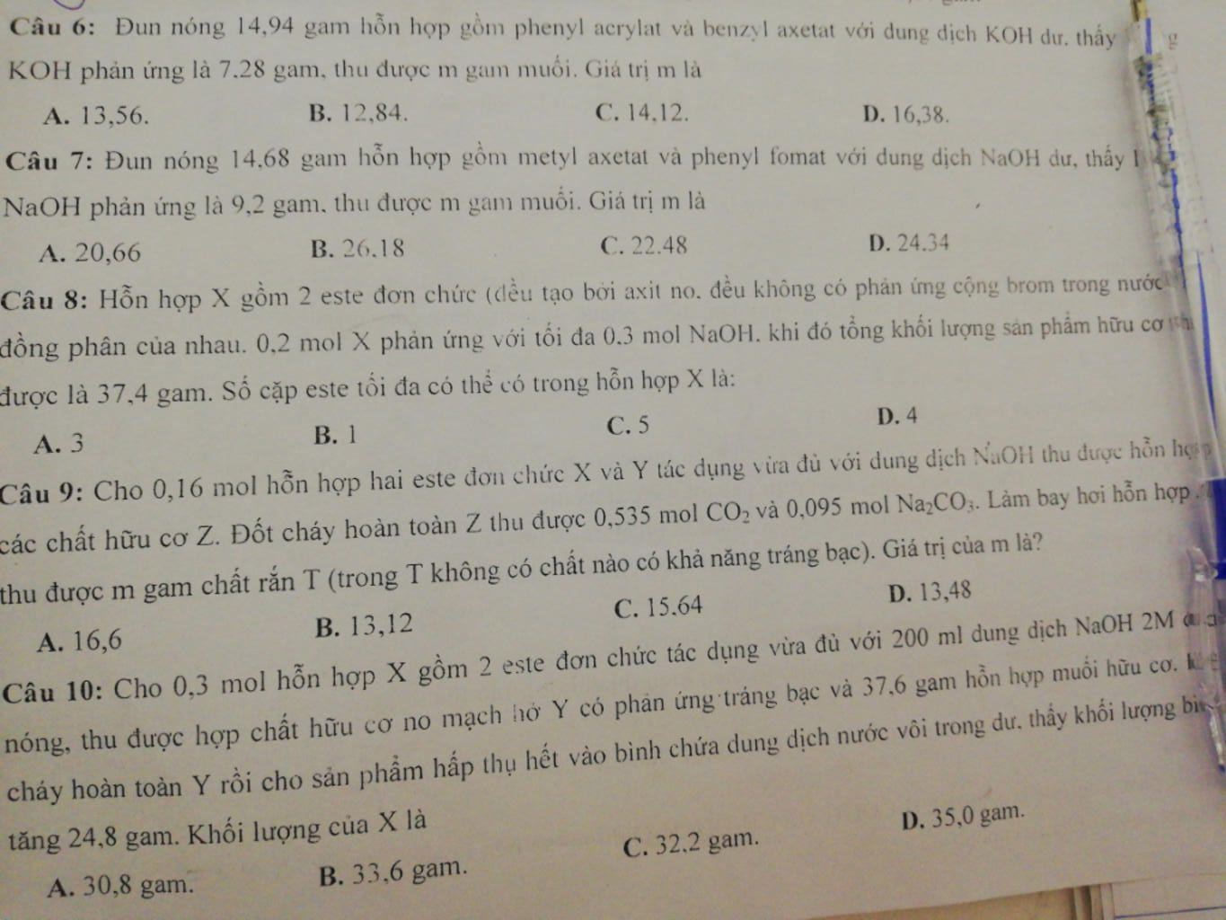 $\begin{gathered} C{H_3}COONa:0,05\,\,mol \hfill \\ HCOONa:0,09\,\,mol\,\,\,\,\, \hfill \\ {C_6}{H_5}ONa:0,09\,\,mol\,\,\,\,\, \hfill \\ \to m = 20,66\,\,gam\,\,\,\,\,\,\,\,\,\,\, \hfill \\ \end{gathered} $