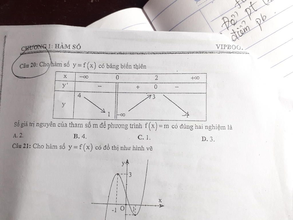 Để phương trình $f(x)=m$ có đúng hai nghiệm thì $-1≤m<1$ hoặc $m=3$