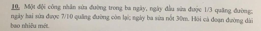$1-\dfrac{1}{3}-\dfrac{7}{15}=\dfrac{1}{5}$ ( Quãng đường )