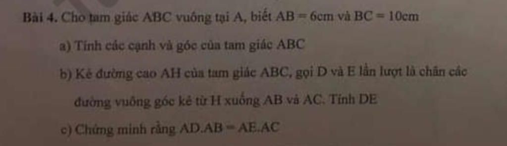b) Kẻ đường cao AH của tam giác ABC, gọi D và E lần lượt là chân các đường vuông góc kẻ từ H xuống AB và AC. Tính DE