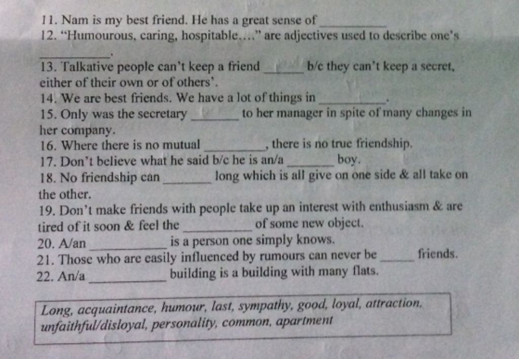 11/Nam is my best friend.He has a great sense of humour (hài hước)
