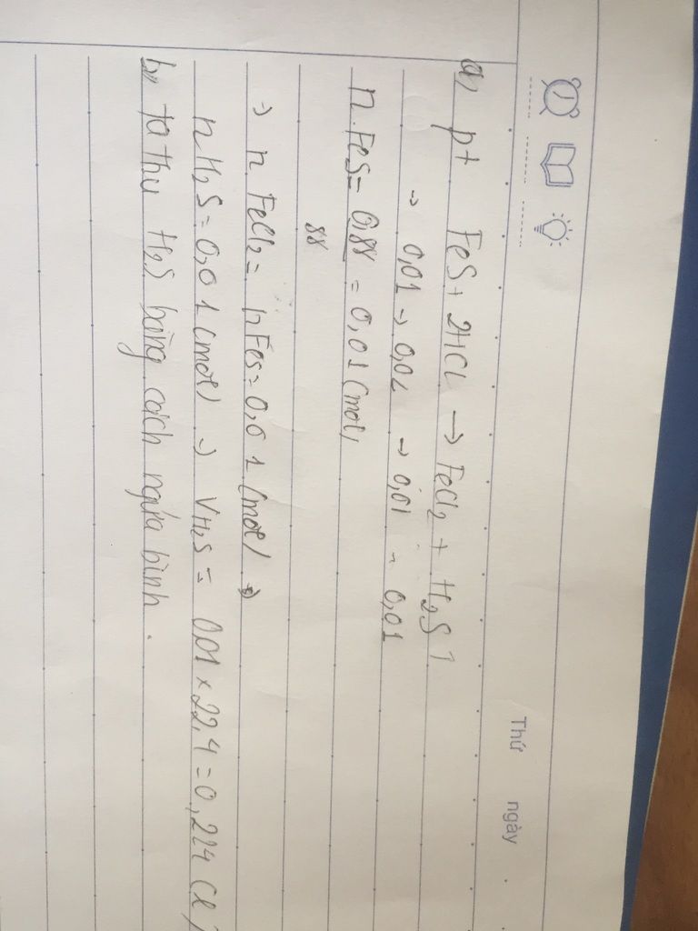 a) Biết khối lượng sắt (II) sunfua tham gia phản ứng là 0,88g. Hãy tìm số mol của FeCl2 tạp thành và thể tích khí H2S thu được (ở đktc).