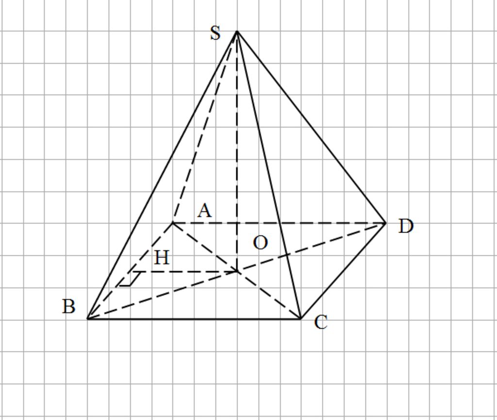 Kẻ $OH⊥AB, OK⊥SH$ có $\left\{ \begin{array}{l}AB⊥OH\\AB⊥SO\end{array} \right.$