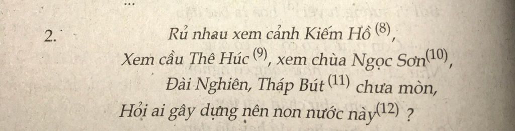 -"Rủ nhau xem cảnh Kiếm Hồ": Kiếm Hồ tức là Hồ Hoàn Kiếm là một thắng cảnh, một lịch sử, văn hóa gắn liền với "Sự tích Hồ Gươm", nới Rùa Vàng ngoi lên đòi lại gươm báu. Câu thơ:" Rủ nhau...Kiếm Hồ" là một câu dẫn, câu gợi cho người đọc, người nghe đến với Hồ Gươm.