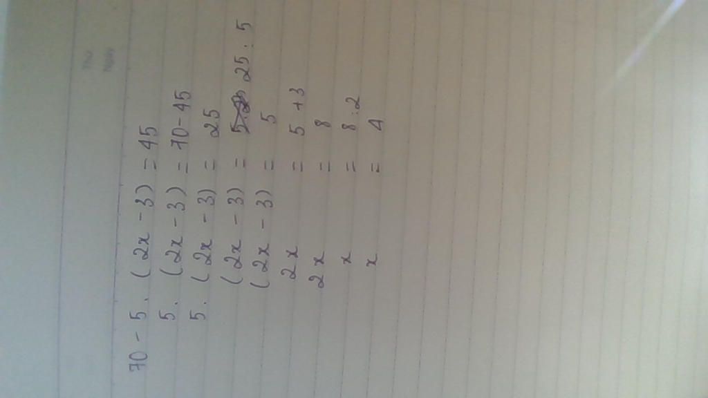 70-5.(24-3)=1554 Em bị gì mà tính ra vậy? 70−5.(2x−3)=45. ⇒70-5.(2.4-3)=45. ⇒70-5.(8-3)=45. ⇒70-5.5=45. ⇒70-25=45. ⇒45=45.
