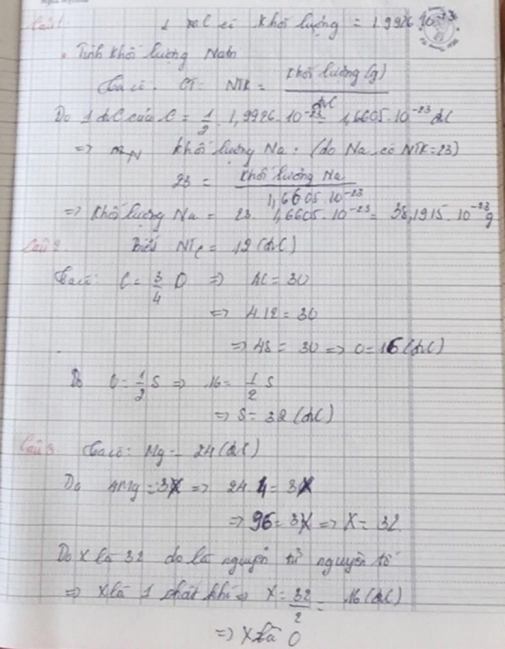 1. Biết nguyên tử C có khối lượng bằng 1.9926.10^- 23 g. Tính khối lượng bằng gam của nguyên tử Natri. Biết NTK Na = 23. (Đáp số: 38.2.10- 24 g)