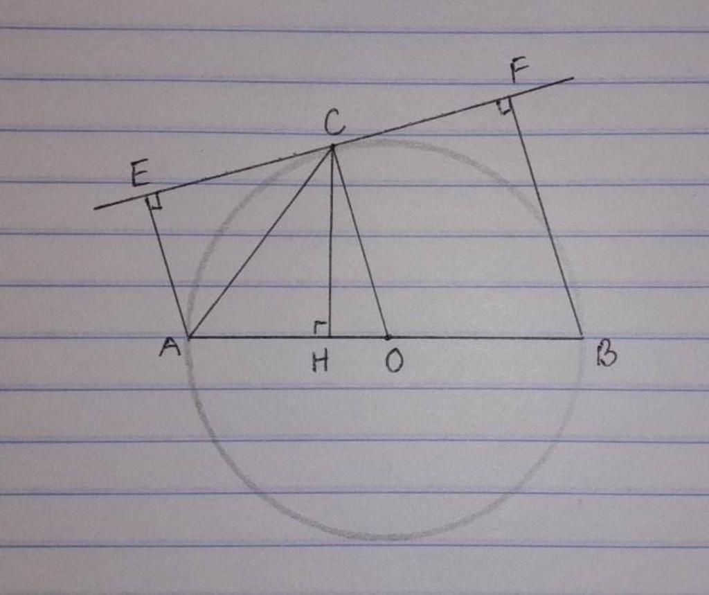 `=>{EC}/{CF}={AO}/{OB}=1` (Vì `AB` là đường kính của `(O)` nên `OA=OB`)