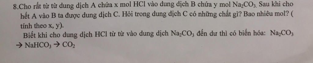Sau phản ứng (1), dung dịch có y mol $NaHCO_3$, y mol $NaCl$ và x-y mol $HCl$. Sau đó x-y mol HCl phản ứng với y mol $NaHCO_3$