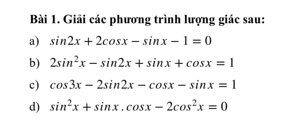$\begin{array}{l}a)\,\,\sin2x + 2\cos x - \sin x - 1 = 0\\ \Leftrightarrow 2\sin x\cos x + 2\cos x - (\sin x + 1) = 0\\ \Leftrightarrow 2\cos x(\sin x + 1) - (\sin x + 1) = 0\\ \Leftrightarrow (\sin x +1)(2\cos x - 1) = 0\\ \Leftrightarrow \left[\begin{array}{l}\sin x = -1\\\cos x = \dfrac{1}{2}\end{array}\right.\\ \Leftrightarrow \left[\begin{array}{l}x = -\dfrac{\pi}{2} + k2\pi\\x = \pm \dfrac{\pi}{3} + k2\pi\end{array}\right.\quad (k \in \Bbb Z)\\ b)\,\,2\sin^2x - \sin2x + \sin x + \cos x = 1\\ \Leftrightarrow \sin x + \cos x = 1 + \sin2x - 2.\dfrac{1 - \cos2x}{2}\\ \Leftrightarrow \sin x + \cos x = \sin2x + \cos2x\\ \Leftrightarrow \sin\left(x + \dfrac{\pi}{4}\right) = \sin\left(2x + \dfrac{\pi}{4}\right)\\ \Leftrightarrow \left[\begin{array}{l}x + \dfrac{\pi}{4} = 2x + \dfrac{\pi}{4} + k2\pi\\x + \dfrac{\pi}{4} = \dfrac{3\pi}{4} - 2x + k2\pi\end{array}\right.\\ \Leftrightarrow \left[\begin{array}{l}x = k2\pi\\x = \dfrac{\pi}{6} +k\dfrac{2\pi}{3}\end{array}\right.\quad (k \in \Bbb Z)\\ c)\,\,\cos3x -2\sin2x - \cos x - \sin x = 1\\ \Leftrightarrow (\cos3x - \cos x)- 2\sin2x - \sin x - 1 = 0\\ \Leftrightarrow -2\sin2x.\sin x - 2\sin2x - (\sin x + 1) = 0\\ \Leftrightarrow -2\sin2x(\sin x + 1) - (\sin x + 1) = 0\\ \Leftrightarrow (\sin x + 1)(2\sin2x + 1) = 0\\ \Leftrightarrow \left[\begin{array}{l}\sin x = -1\\\sin2x = -\dfrac{1}{2}\end{array}\right.\\ \Leftrightarrow \left[\begin{array}{l}x = - \dfrac{\pi}{2} + k2\pi\\x = -\dfrac{\pi}{12} + k\pi\\x = \dfrac{7\pi}{12} + k\pi\quad (k \in \Bbb Z)\end{array}\right.\\ d)\,\,\sin^2x + \sin x.\cos x - 2\cos^2x = 0\\ \text{Nhận thấy $\cos x =0$ không là nghiệm của phương trình}\\ \text{Chia 2 vế của phương trình cho $\cos^2x$ ta được:}\\ \tan^2x + \tan x - 2 =0\\ \Leftrightarrow \left[\begin{array}{l}\tan x = 1\\\tan x = -2\end{array}\right.\\ \Leftrightarrow \left[\begin{array}{l}x = \dfrac{\pi}{4} +k\pi\\ x = \arctan(-2) +k\pi\end{array}\right.\quad (k \in \Bbb Z) \end{array}$