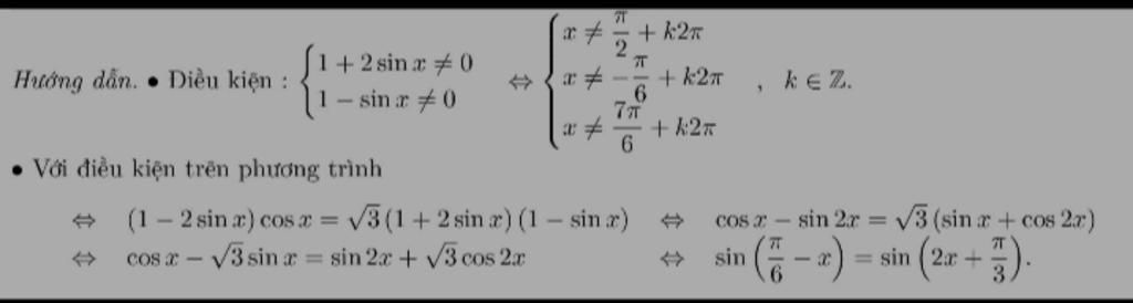 $ PT ⇔ (1 - 2sinx)cosx = \sqrt{3}(1 + 2sinx)(1 - sinx)$