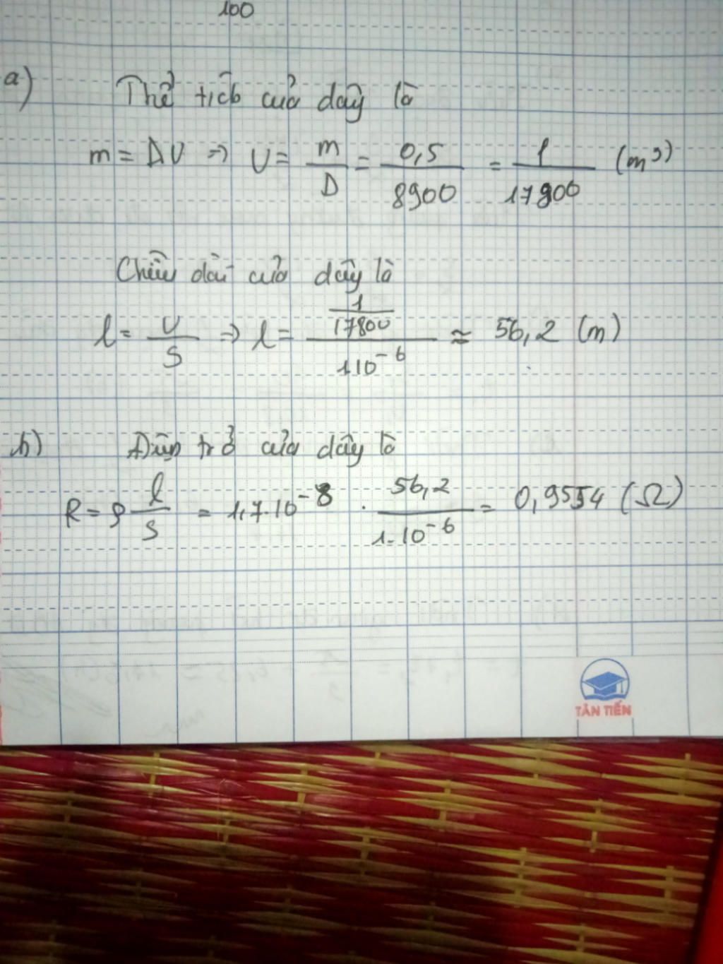 $R= \dfrac{\rho.l}{S} = \dfrac{1,7.10^{-8}.56,18}{10^{-6}} = 0,95506 (\Omega)$