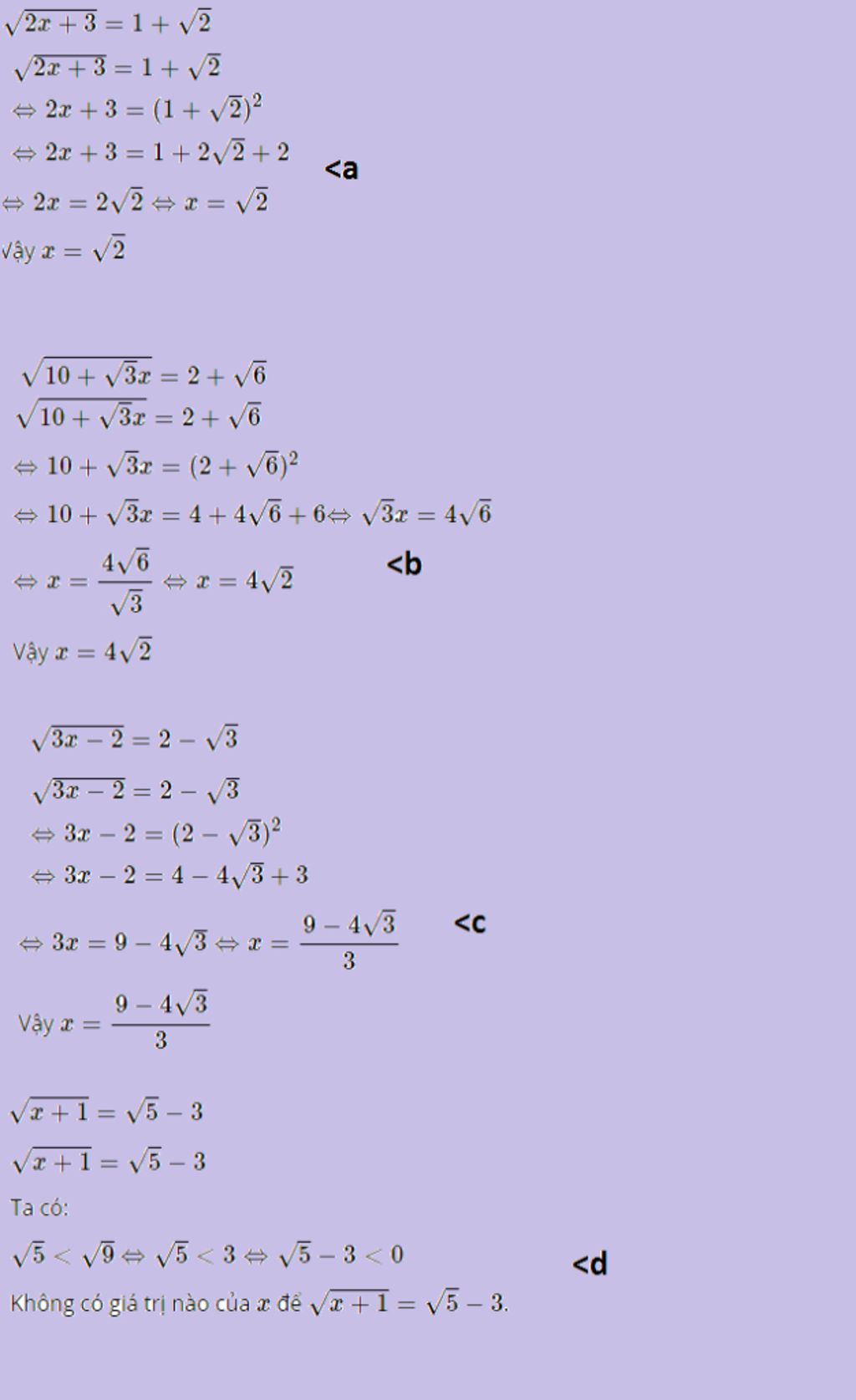 c)√(3x-2)=2-√3 DK: x≥2/3 d)√(x+1)=√5-3