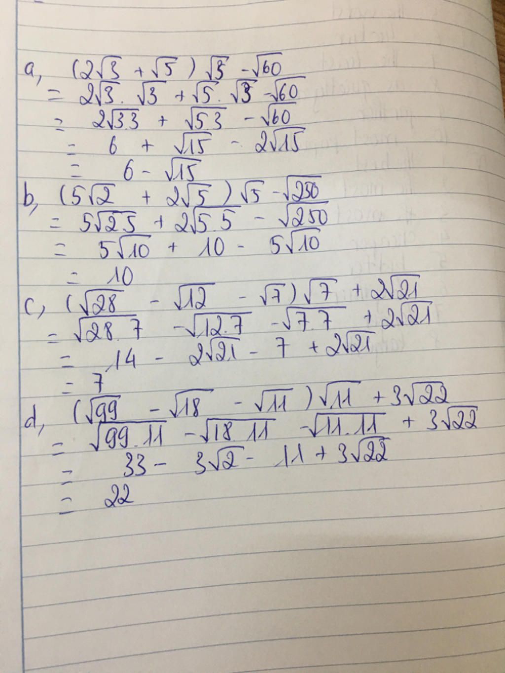`(5sqrt{2}+2sqrt{5})sqrt{5} - sqrt{250} `