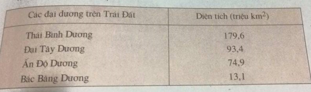 Tổng diện tích bề mặt 4 đại dương: 179,6 + 93,4 + 74,9 + 13,1 = 361 triệu $km^{2}$