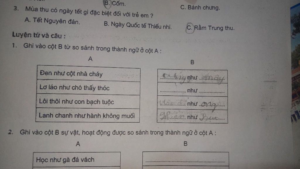 Mình nghĩ là đề bài nó bảo là Điền các vế của cột A vào mấy chỗ trống.
